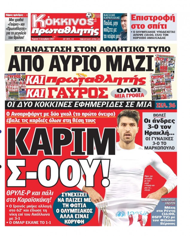 Διαβάστε τα πρωτοσέλιδα των αθλητικών εφημερίδων για σήμερα Κυριακή (3/12).