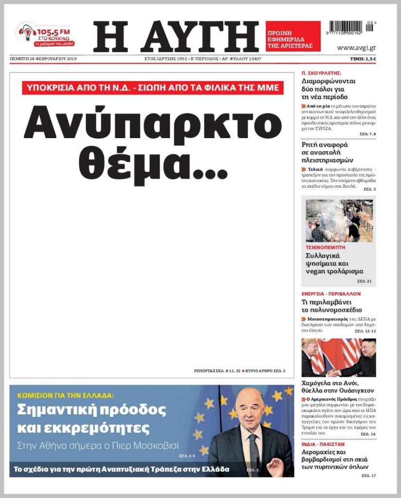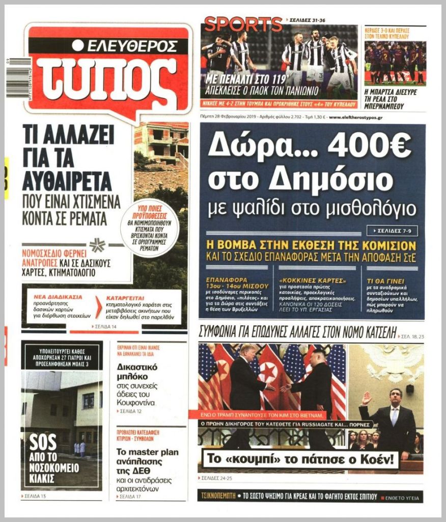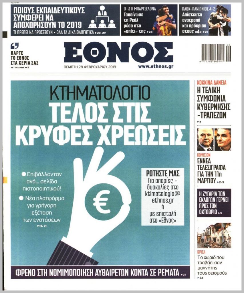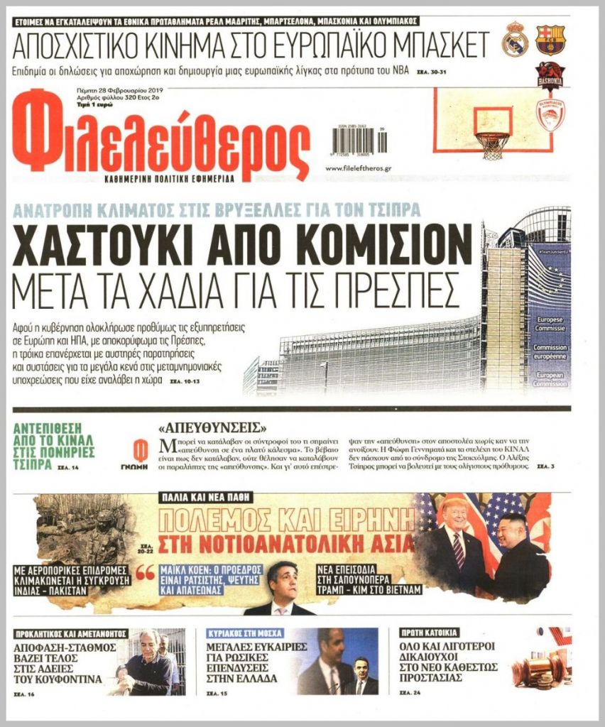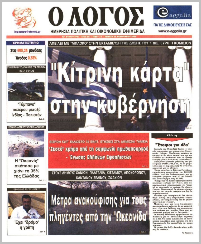 Τα πρωτοσέλιδα των πολιτικών εφημερίδων για σήμερα (28/2)
