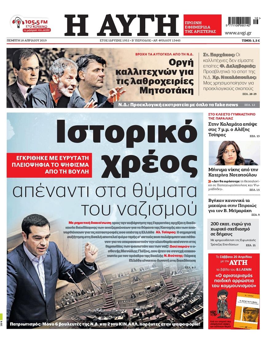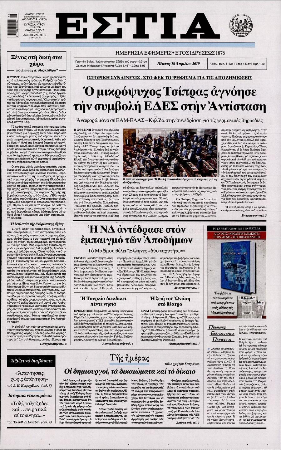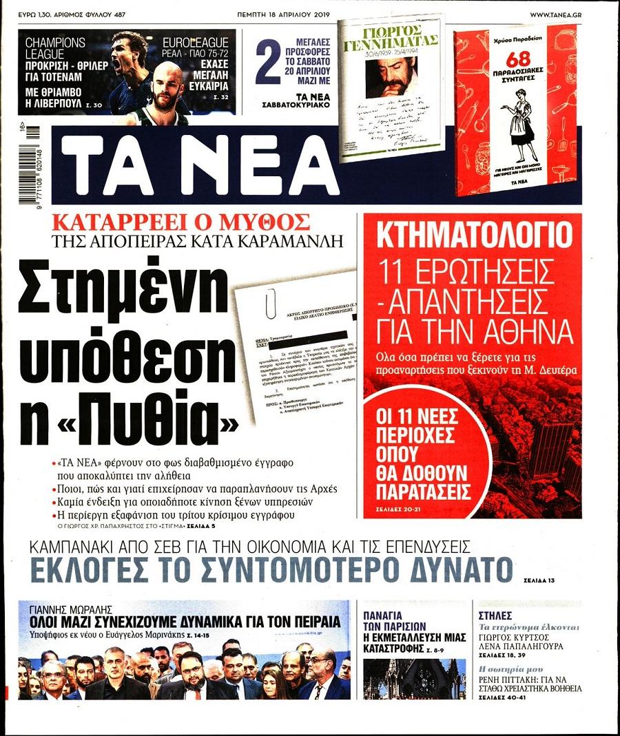 Τα πρωτοσέλιδα των πολιτικών εφημερίδων για σήμερα (18/4)