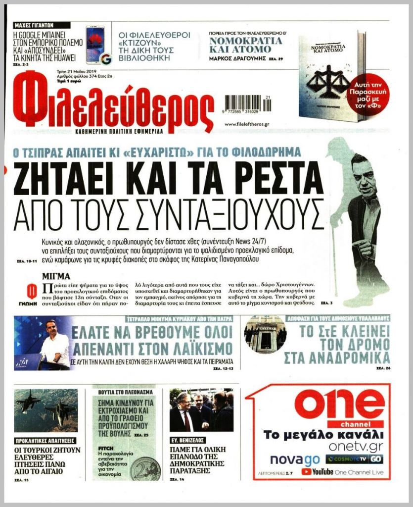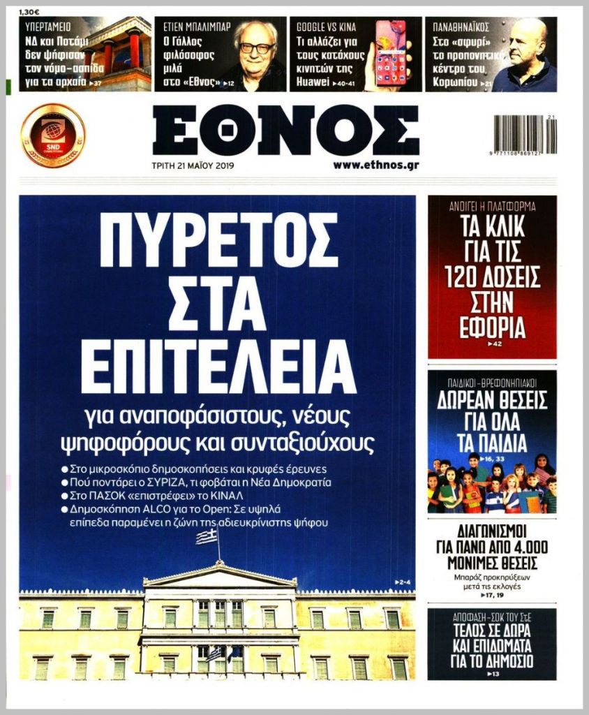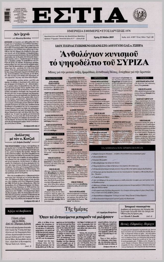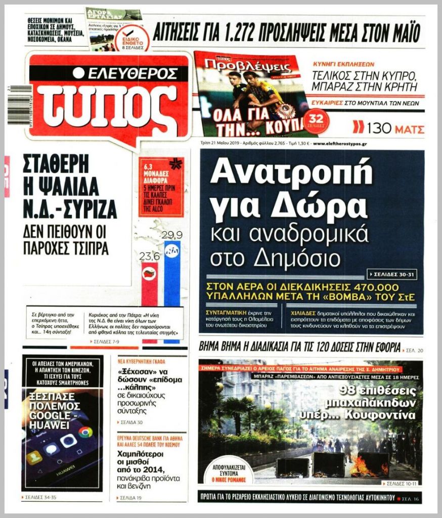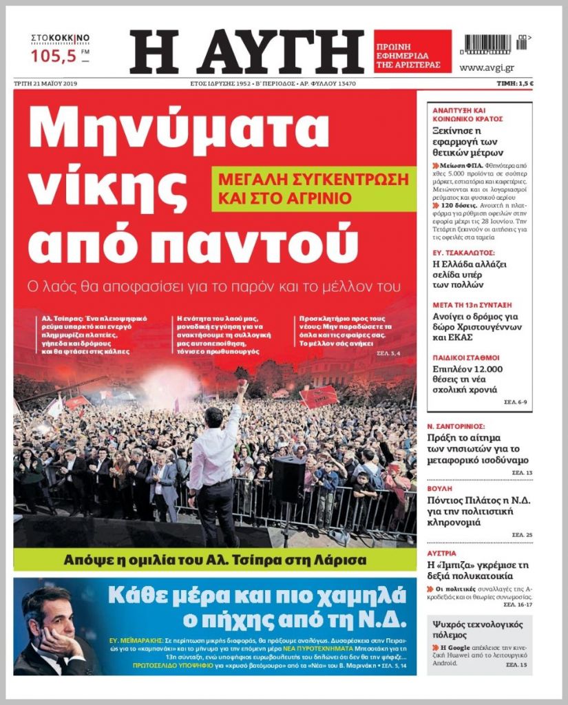 Τα πρωτοσέλιδα των πολιτικών εφημερίδων για σήμερα (21/5)
