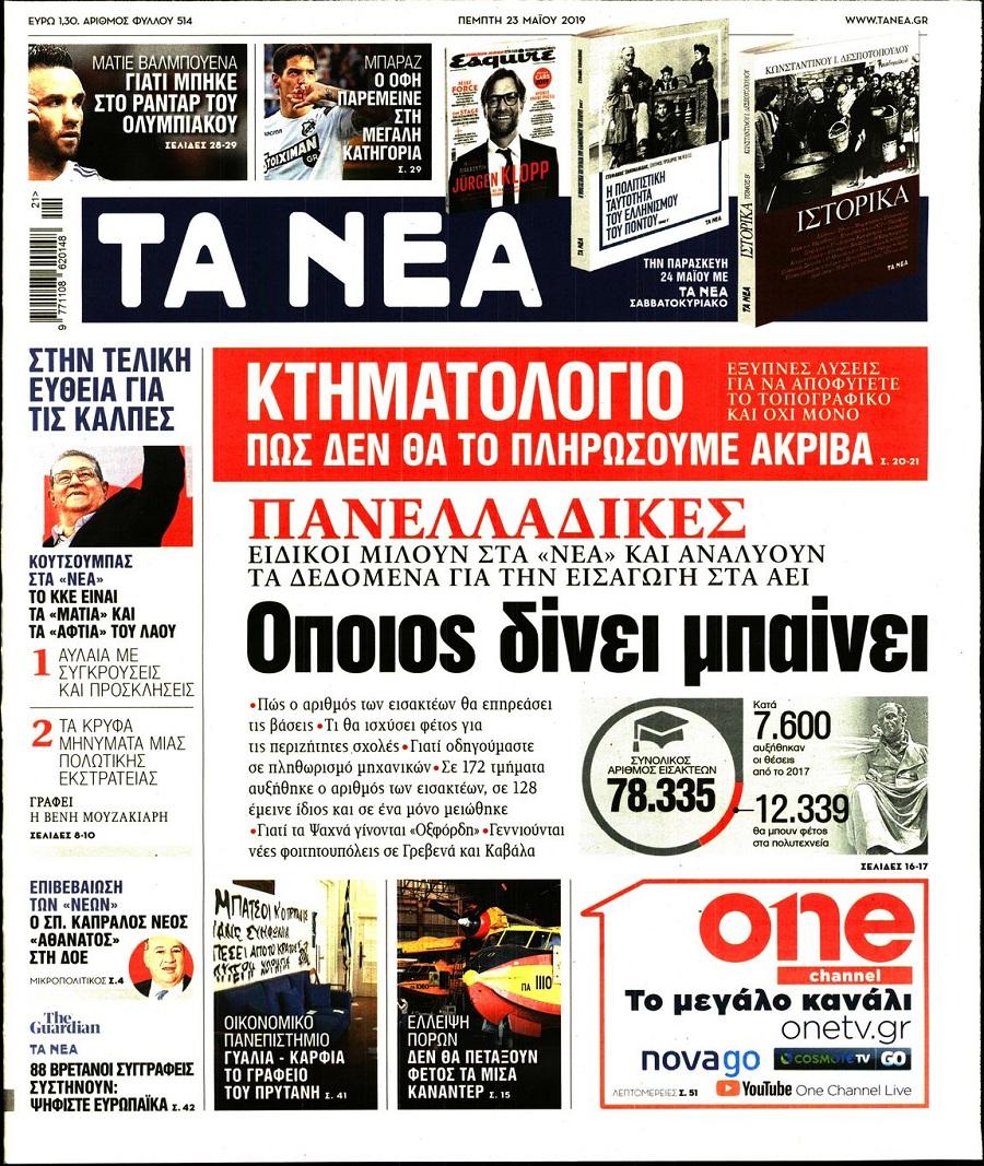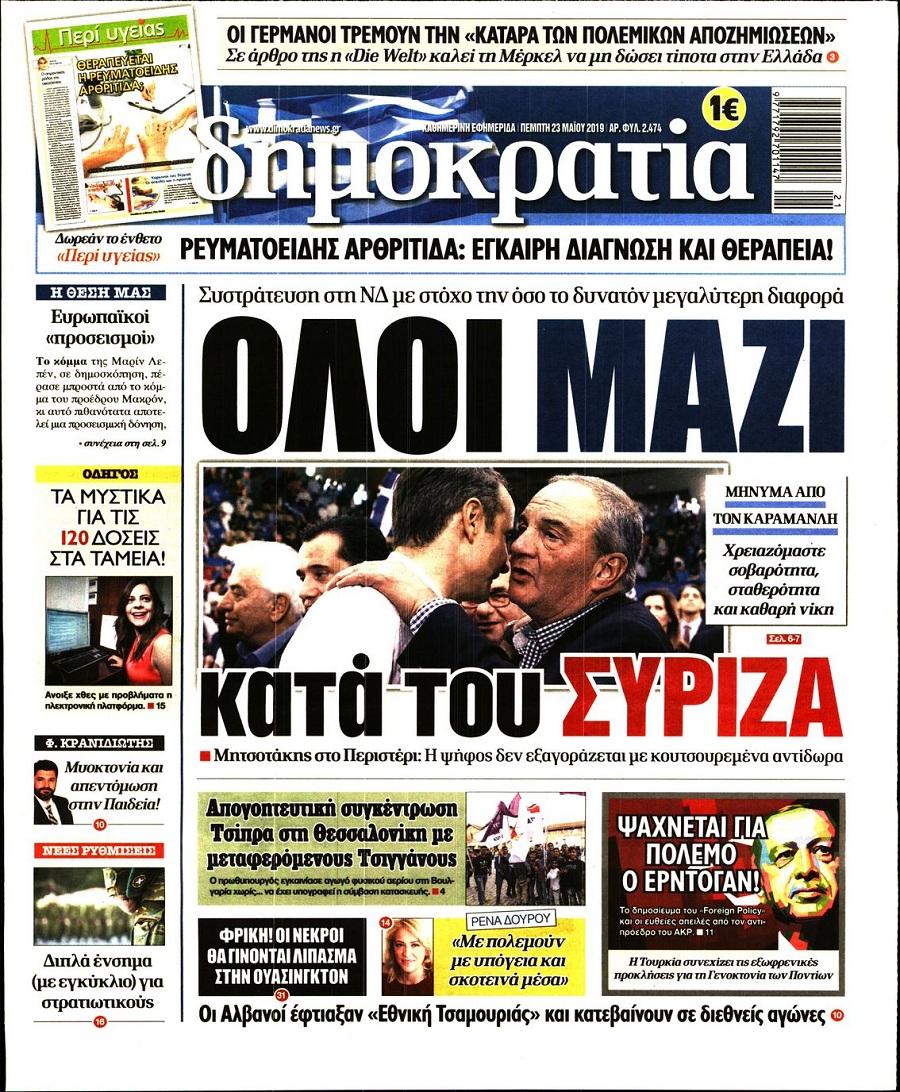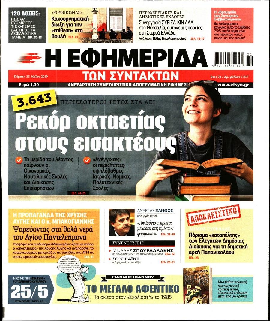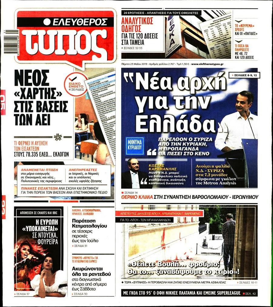 Τα πρωτοσέλιδα των πολιτικών εφημερίδων για σήμερα (23/5)
