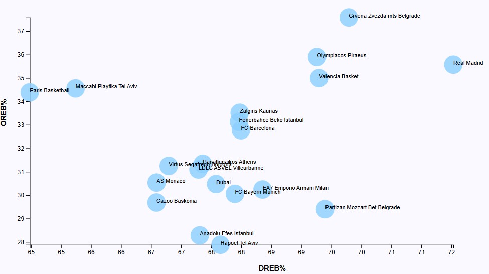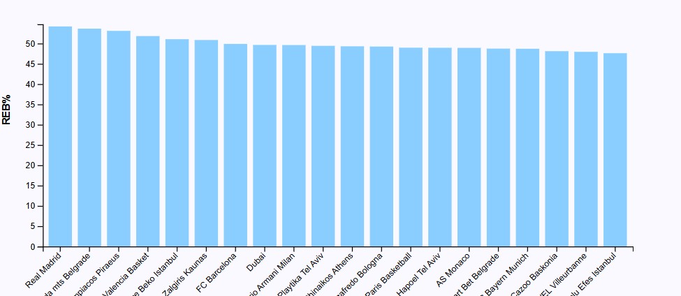 Όσον αφορά τα ριμπάουντ, οι «νυχτερίδες» έκαναν εξαιρετική δουλειά, μένοντας σταθερά στην πρώτη πεντάδα σε όλες τις κατηγορίες. Κατέβαζε το 51.8% των συνολικών διαθέσιμων βρισκόμενη στην 4η θέση. Μάζευε το 69.3% των αμυντικών διαθέσιμων βρισκόμενη στην 4η θέση, ενώ έπαιρνε το 35% των επιθετικών διαθέσιμων βρισκόμενη επίσης στην 4η θέση της λίστας.
